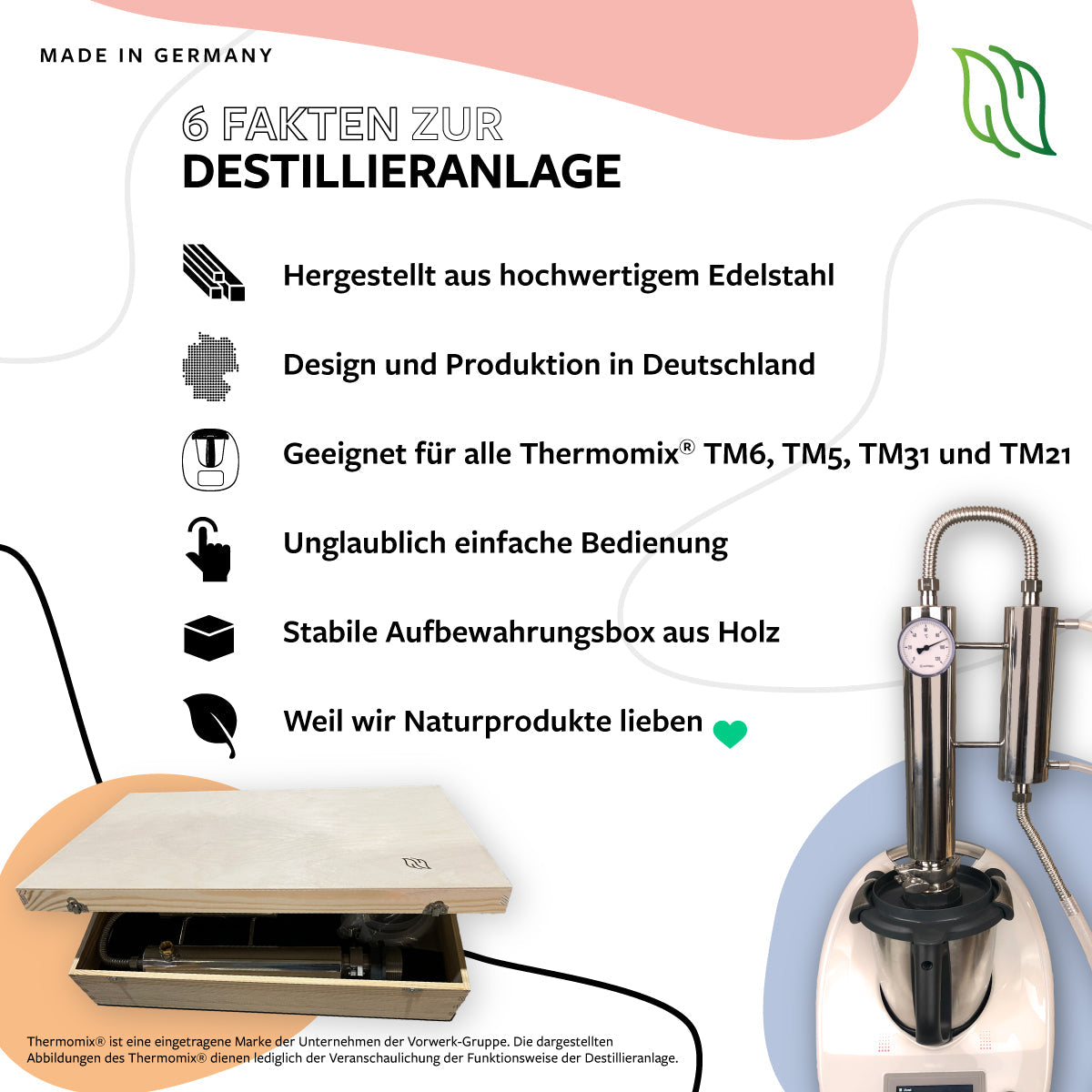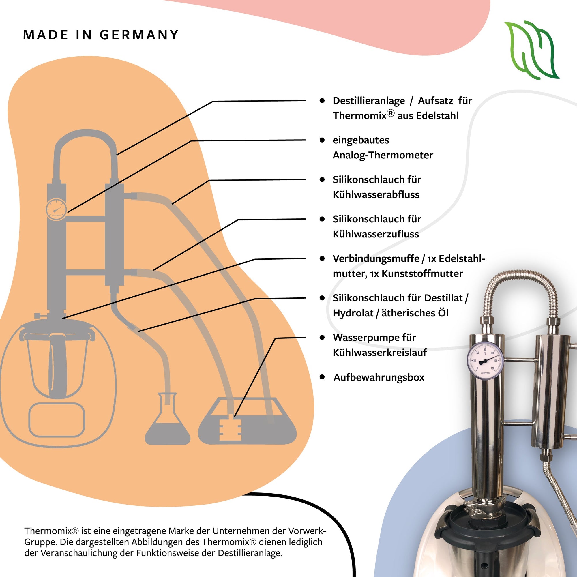 - Einfache & sichere Anwendung – Plug & Play-Installation für den Thermomix®, destilliere ohne Vorkenntnisse Hydrolate, ätherische Öle, Gin & mehr!